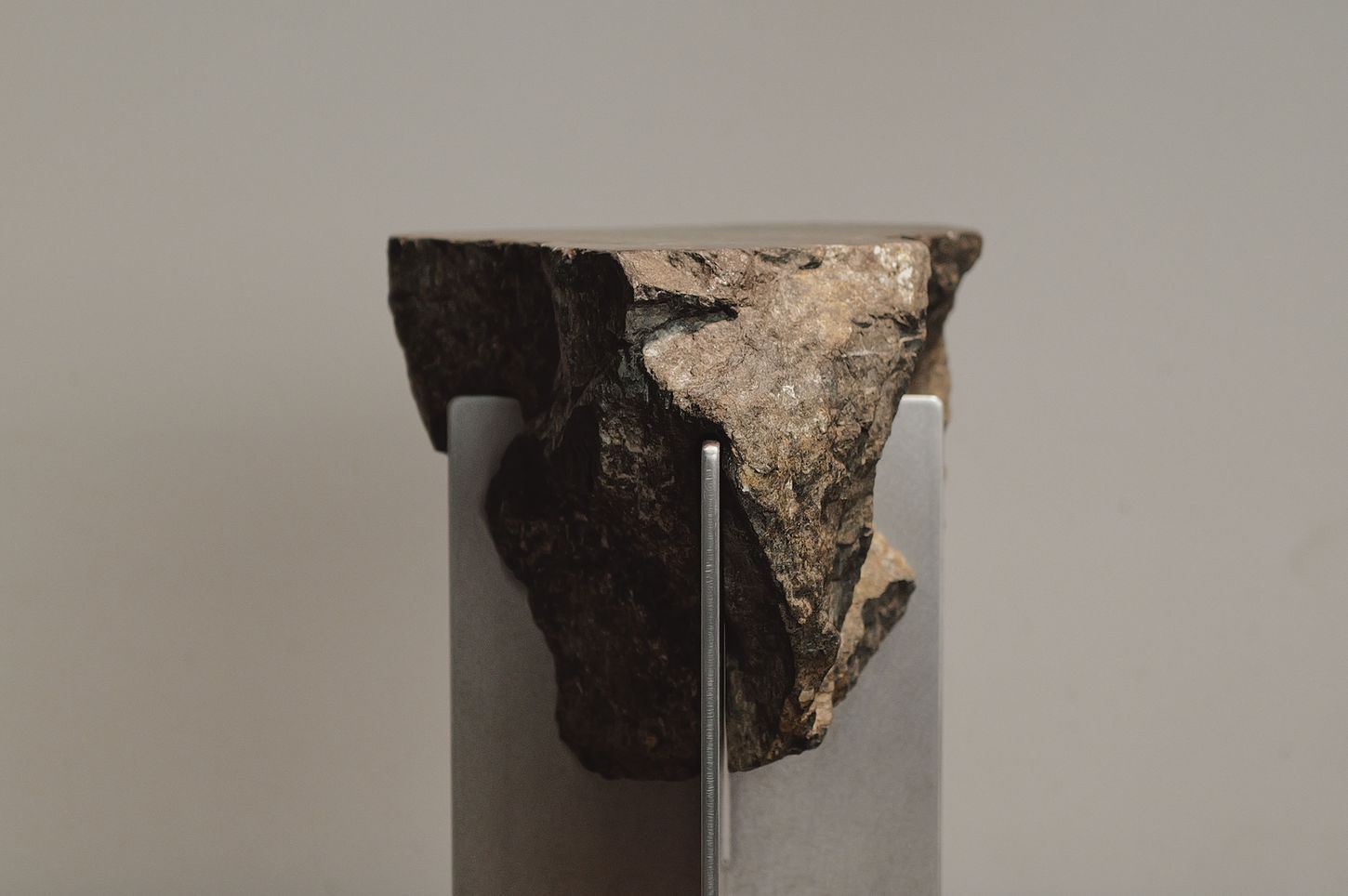 Hybrid objects explores the literal intersection of nature and the human-made. This series uses leftover boulder ends from paving fabrication processes and displays them on delicate hand-finished aluminum pedestals to showcase the stone in its almost unaltered form. The rough jewel-like objects are unique in shape, color, and texture. Custom dimensions are available.